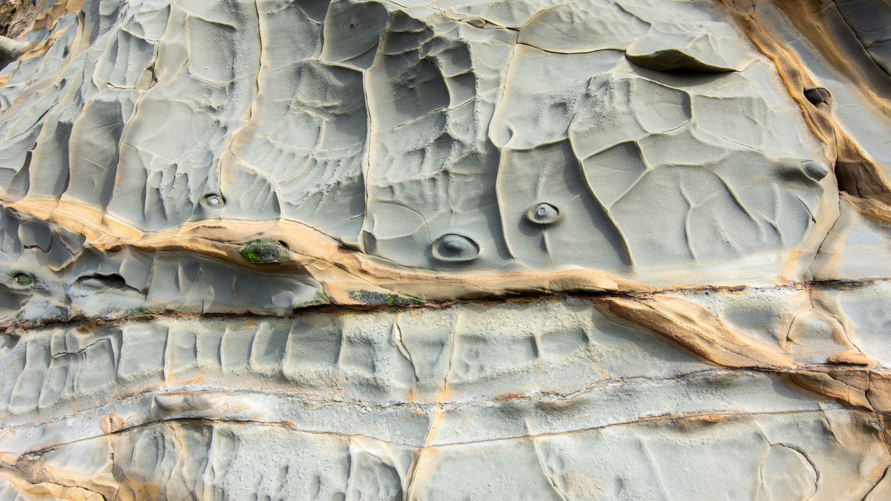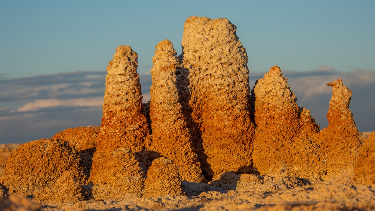 Dit zijn afzettingen van in zee levende bacteriën. Het zijn “dus” fossielen. Hier gefotografeerd bij een dieprode zonsondergang. De volgende ochtend waren ze weer gewoon grijzig.