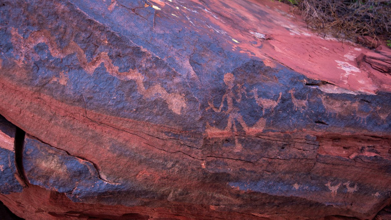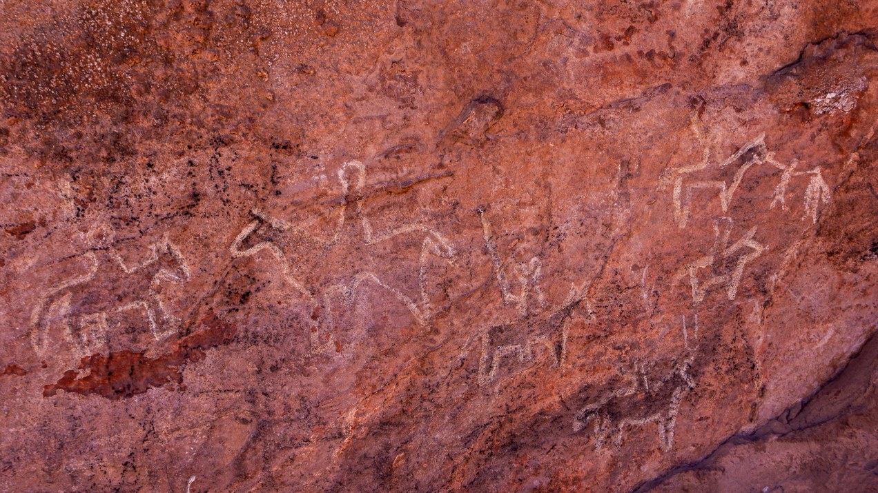 We wandelen naar grotten met rotstekeningen. De daar wonende gids leidt ons rond en vertelt over vandalisme. Mensen kunnen het niet laten om ook hun eigen tekeningen te maken. Hij vindt het ook wangedrag dat de Spanjaarden hier tekeningen maakten van paarden. Voor de komst van de Spanjaarden waren hier immers geen paarden.