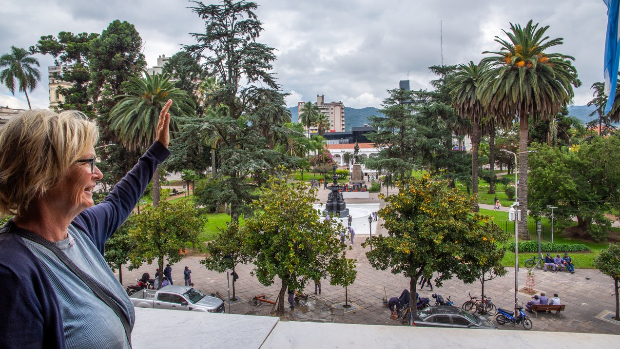 Roelien staat hier te wuiven op het balkon van het gouverneursgebouw van Jujuy. Dezelfde plek waar ook onze Koningin Maxima heeft gewoven. Vermoedelijk had die iets meer publiek.
