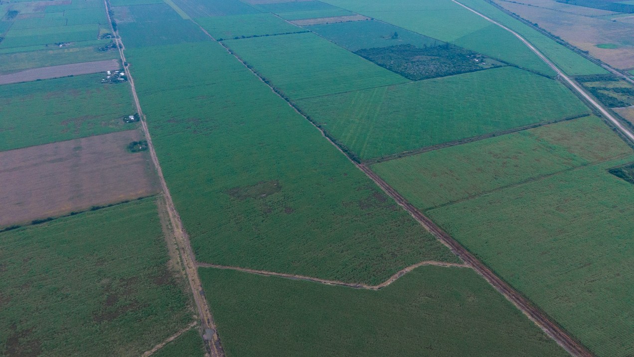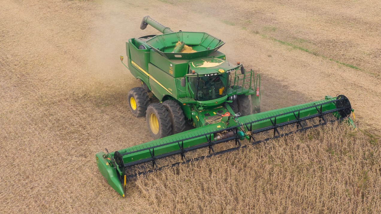 Met 12 meter brede maaibalken wordt de soja-oogst binnengehaald en als sojaschroot (veevoer) naar China geëxporteerd.