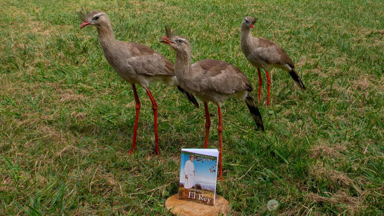 In Parque Nacional El Rey zijn de kuifseriema heel nieuwsgierig. Zelfs het boek over de Estancia El Rey willen ze lezen. Denken wij.