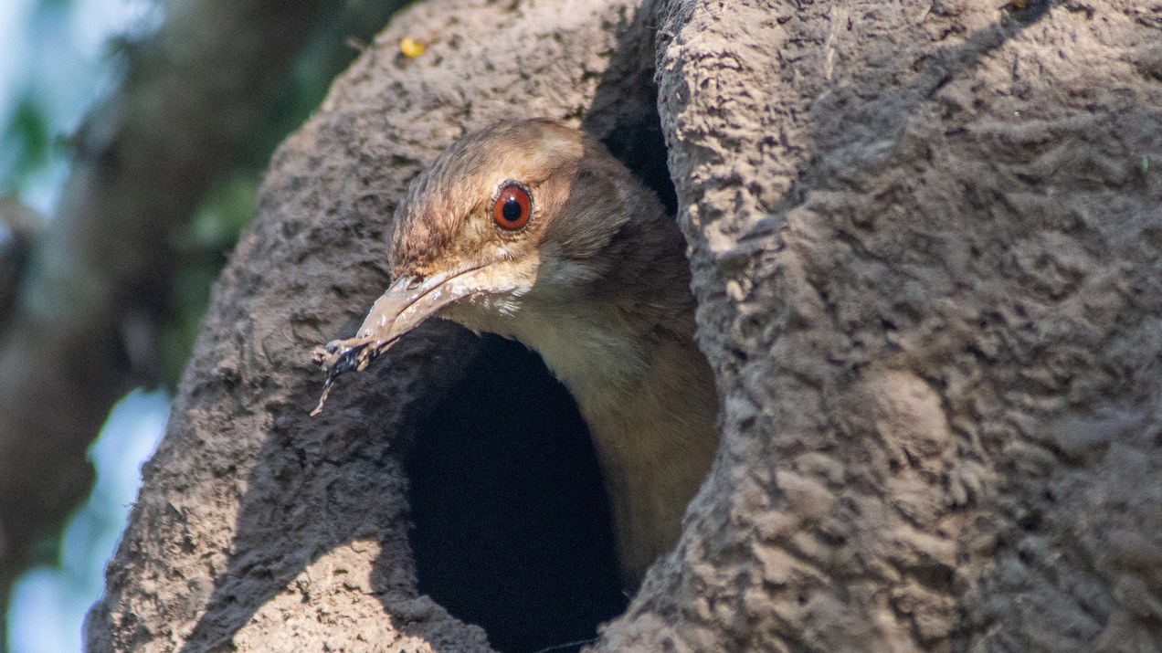 Formeel is zijn naam zelfs de roze ovenvogel. Hier met klei in zijn/haar bek om het nest verder af te maken. Het nest lijkt op een klei-oven.