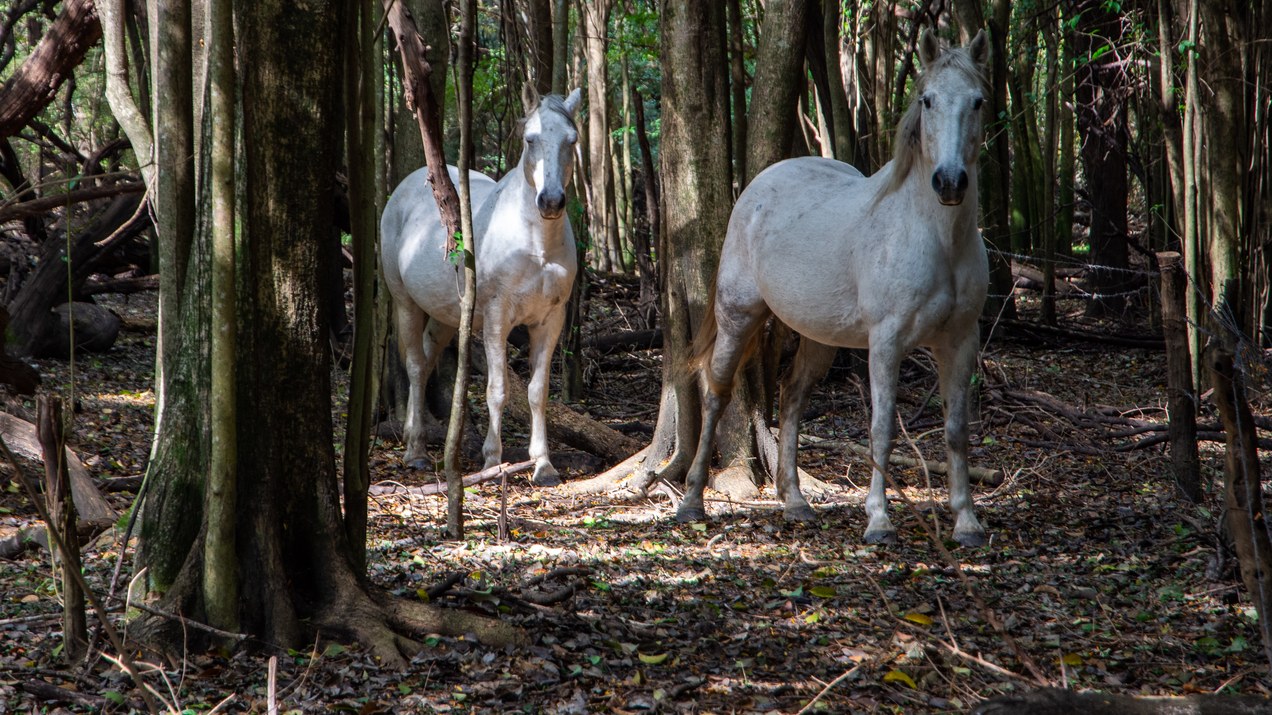 We maken een prachtige struinwandeling in een klein nationaal park langs een diep uitgesleten rivier. Zowel wij als deze paarden struinen door het gebied.
