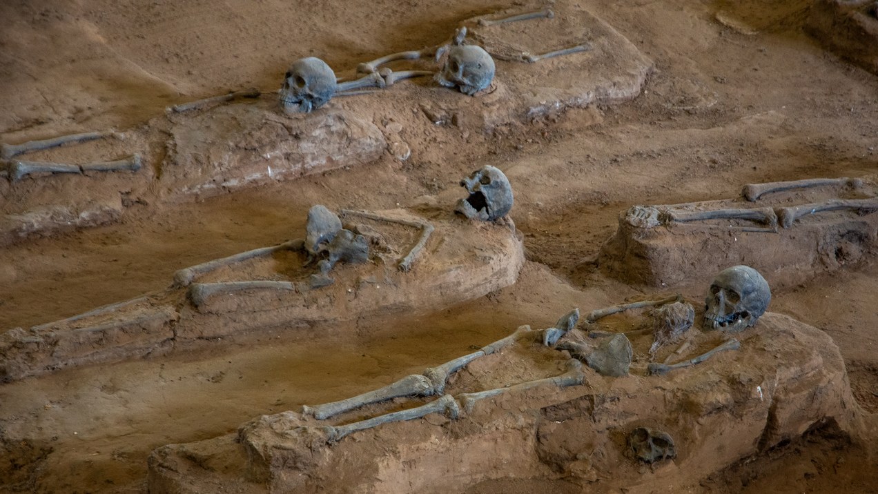 Op de foto de graven onder de oude Fransiscanerkerk. De skeletten zijn niet meeverhuisd.