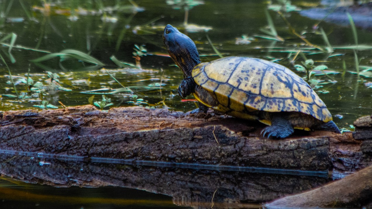 Deze schildpad wandelt op een boomstam die in de rivier drijft.