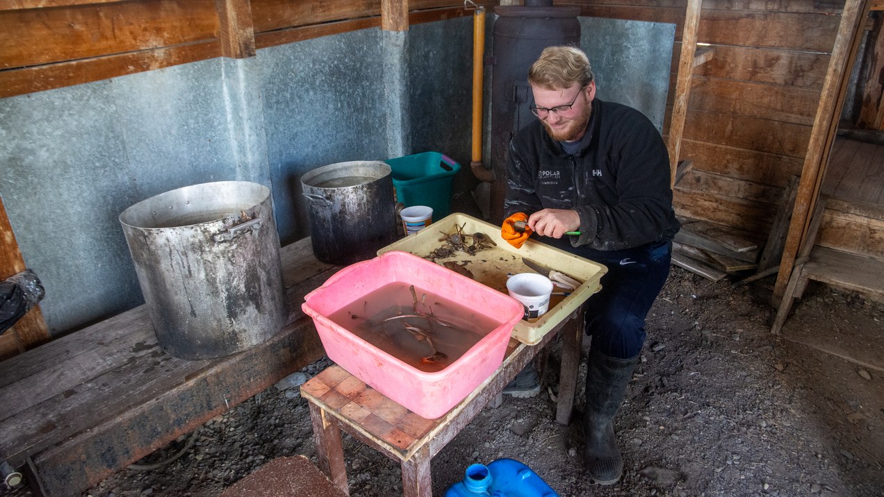 In het zeezoogdierskelettenmuseum ontmoeten we Donald uit de USA. Hij is hier als vrijwilliger met een tandenborstel botten aan het schoonmaken. Met het skelet van een potvis is hij een maand of 2 bezig.