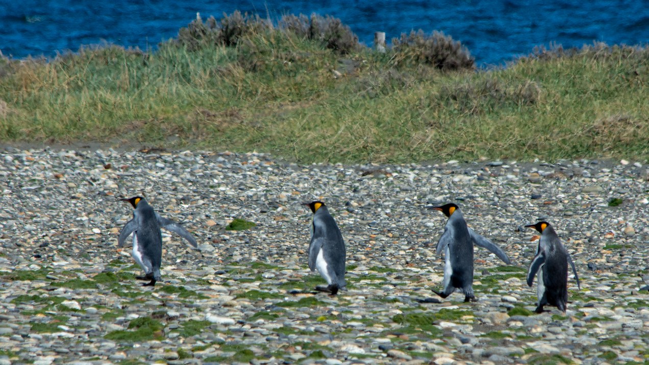 Wie kent de LP-hoes niet van de Beatles waarop ze met z’n 4-en op een zebrapad lopen. Deze vier Koningspinguïns lopen hier niet op Abbey Road, maar schrijden weer terug naar hun kolonie. Ze zitten nu in een rustige periode: de jonkies zijn bijna een jaar oud en hoeven niet meer gevoerd te worden. De ouders zijn nu in de rui en krijgen straks weer mooie waterafstotende veren. Handig als je tot 200 meter diep gaat duiken.