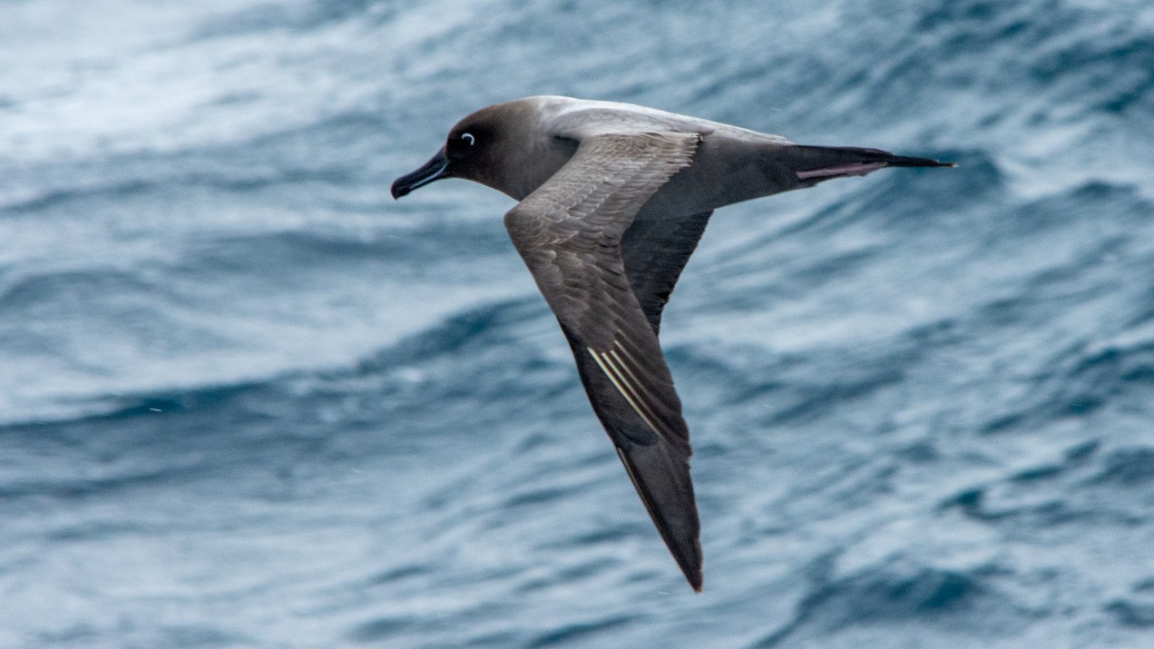 Leuk dat vogels boven ons schip hangen, maar fotograferen ervan wordt er dan niet makkelijker op. Toch hier de roetkopalbatros vanaf het bovendek van de heftig schommelende MV Ushuaia.