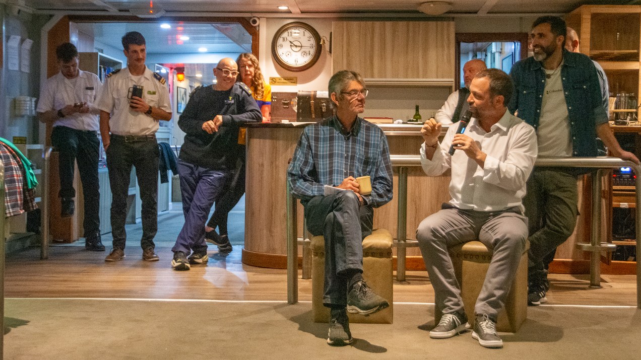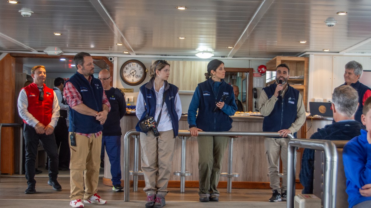 Er zijn 30 bemanningsleden aan boord om het schip 24 uur per dag te laten varen en om de Zodiacs in te zetten. Voor het beantwoorden van al onze vragen en het geven van lezingen is er een tour leader, een vogelbioloog, een zeebioloog, een ijsdeskundige en een geoloog. De lezingen zijn van een hoog niveau en maken ons er nog bewuster van hoe kwetsbaar de Antarctische natuur is voor de opwarming van de aarde. Misschien haal je je schouders op over het verdwijnen van pinguïnsoorten, mossen of vogels, maar als hier de gletsjers echt gaan smelten, dan merken we dat wereldwijd.