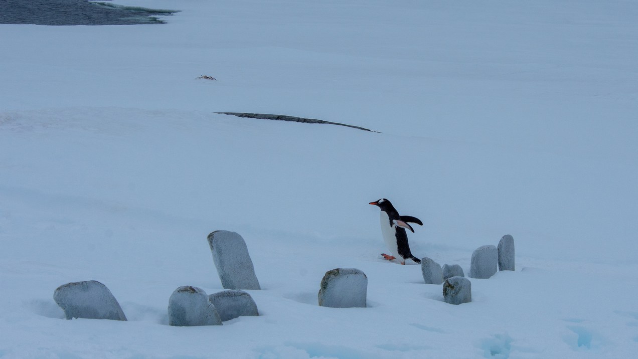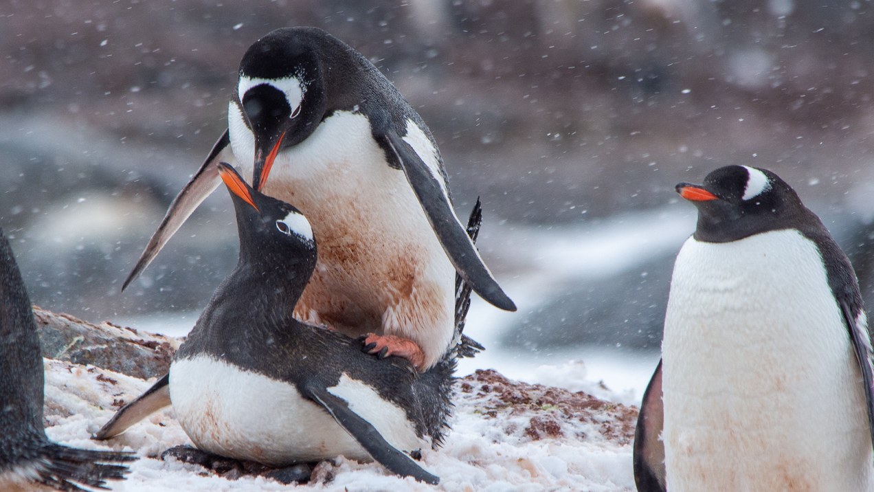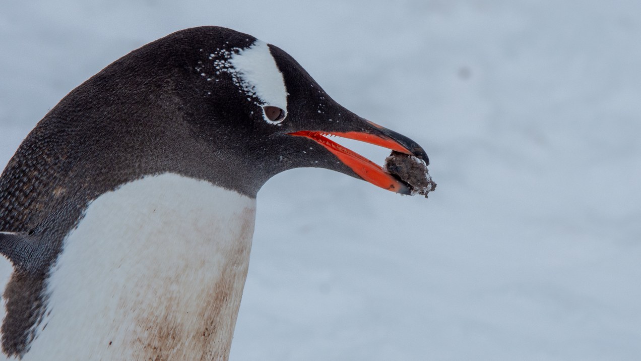 Het is een uitdaging om hier een nest te bouwen. Op de sneeuw is te koud voor de eieren. Dus het moet op de rotsen. Maar hoe kom je aan nestmateriaal hier? Geen gras, alleen wat modderkluitjes. En die willen de ander pinguïns ook. En de aalscholvers. Het verzamelde materiaal wordt dan ook goed bewaakt.