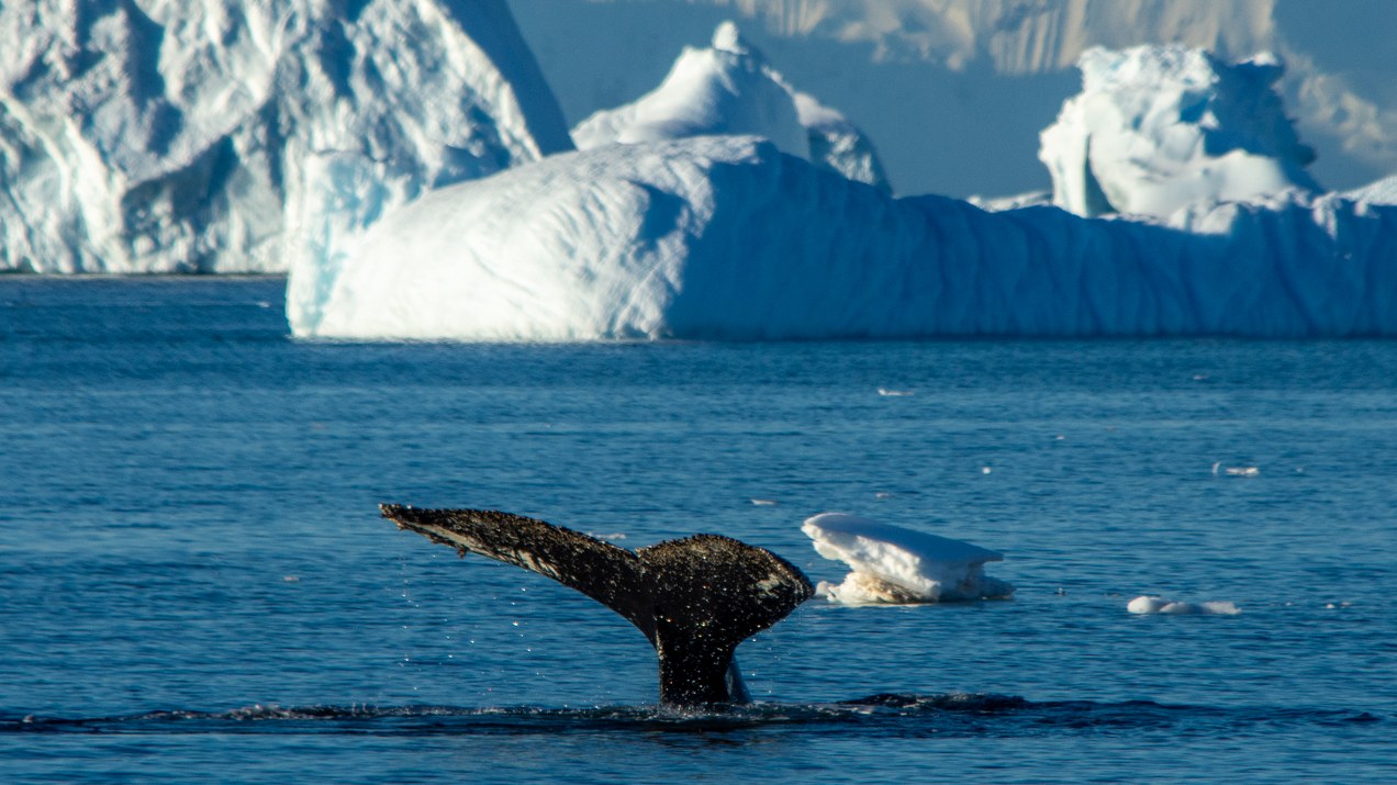 Leuker is om nu levende walvissen te zien. Vanaf de MV Ushuaia zien we regelmatig bultruggen. Het patroon in de staart is voor elke bultrug uniek. Er bestaan dan ook overzichten van de staarten, zodat je van je eigen waarneming kan zien welke bultrug dat is. Helaas hebben we dat niet goed op de foto…