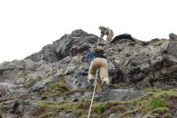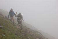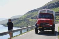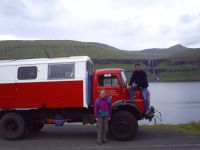 Op 6 juli neem ik de trein naar Breukelen. In Breukelen wonen Cock en Roelien, de sympathieke Nederlanders met wie ik op IJsland-avontuur ga! Om 19.00 vertrekken we met de Bravo. De Bravo is een kleine Duitse brandweerwagen die Cock en Roelien op een lumineuze wijze omgebouwd hebben tot een gezellige camper en waarmee we rivieren zullen oversteken in het ruige binnenland van IJsland. Onze eerste stop is een aardappelveld in Salzbergen, waar we overnachten. Op 7 juli rijden we door Duitsland en een stukje door Denemarken. 's Avonds kamperen we in een bos ergens in Denemarken. Ik heb geen idee waar, want 'we' hadden de kaart van Denemarken vergeten. 8 juli worden we 's morgens vroeg bij ons ontbijt verrast door een haas, die op zijn dooie gemak kwam aangehuppeld maar bij het zien van de Bravo zich wel een bult moet zijn geschrokken. Ik besluit om met Cock mee te gaan lopen. Cock zal aan de marathon van Reykjavik deelnemen op 19 augustus en moet zich nog op die marathon voorbereiden. We lopen door een prachtige weidse omgeving met bossen en velden. We verlaten al gauw de zandweggetjes en lopen dwars door graan- en aardappelvelden met brandnetels. Alles verloopt vrij goed tot ik last krijg van mijn achillespees en niet meer verder kan lopen. Aan de rand van het bos springt een ree weg. Met behulp van de GPS vinden we Roelien en de Bravo terug. Roelien was al een beetje ongerust en toen ze onze zwaar toegetakelde benen (vol van brandnetelsporen) zag, vroeg ze wat wij in godsnaam hadden uitgespookt. Om 17u komen we in Hanstholm (gevonden door GPS!) aan, waar we inchecken. We varen met ongeveer anderhalf uur vertraging af om 22u30. 9 juli. Rustige vaart, zonnig weer. Spectaculaire doortocht midden door groene Shetlands. De eilanden dreven aan beide kanten aan ons voorbij en er scheen maar geen eind aan te komen. 's Avonds genieten we van het uitgebreide buffet aan boord. Het personeel blijkt voor een groot deel uit Polen te bestaan! 10 juli. Land in zicht! Daar zijn ze dan, de Faroereilanden! Hier volgt een woordje uitleg over deze eilanden. De Faroer (schapeneilanden) liggen ten noordwesten van Schotland, halfweg tussen Noorwegen en IJsland in de Noordatlantische Oceaan, Greenwich-time. Ze bestaan uit 18 eilanden. 's Zomers is het er gemiddeld 11 graden warm en het weer is er zeer wisselvallig. Van juni tot augustus zijn er de witte nachten. De zon gaat onder om 23u30 en gaat op om 3u30. Er wonen 48920 mensen. De Faroer zijn autonoom, behoren tot Denemarken, maar niet tot de EU, omwille van de visserij. De taal stamt af van het Oudnoors. De religie is lutheranisme. De industrie bestaat voor 97% uit visindustrie. Voor de wolindustrie, die vroeger zo belangrijk was, is er nu helaas geen markt meer. De eerste bewoners waren Ierse monniken (500-800). Daarop volgt de Noorse kolonisatie met de Vikingen en daarna de Deense overheersing. Sinds 1948 zijn de Faroer een autonome parlementaire democratie. De munteenheid is de Faroese kroon, maar je kunt er ook met Deense kroon betalen. Ze hebben een sterk nationaal gevoel, wat blijkt uit hun eigen taal (pas heel recent opgetekend, bestond vooral uit dialecten), nationale dans (kettingdans) en nationale feestdag (Sint Olavsfest 28-29 juli). Nog een traditie wil ik jullie niet onthouden: de grindadrap of walvissenjacht. Op grindadrap varen heel wat bootjes op zee om zoveel mogelijk walvissen te vangen. Vervolgens worden ze op het strand gesleept en bewerkt met messen en harpoenen. Op 15 min. worden wel 100 walvissen gedood, waarbij de grindevise wordt gezongen: '' We are strong men, killing whales is our greatest joy''. Deze traditie komt van de Vikingen en Greenpeace heeft haar nog niet kunnen verbieden. De aankomst om 6u 's morgens in Torshavn (spreek uit Tors-hown) ziet er al veelbelovend uit. De vele gekleurde huisjes blaken in de zon tegen de groene heuvels aan. We nemen de kustroute via Kollafjordur, rijden over de brug naar het tweede eiland, Eysturoy, via Eidi (spreek uit: oy) en Funningur. De route is heel mooi. Grote groene heuvels worden doorsneden door fjorden. De eilanden liggen zeer dicht bij elkaar, zodat je altijd vanop het ene eiland wel een deel van het andere kan zien. Omdat er aanvankelijk niet veel mist is, enkel aan de top van de hoogste bergen, besluiten we om ons te wagen aan de beklimming van de Slaettarratindur. Dit is de hoogste berg van de Faroer (882 m). In onze gids staat niet echt duidelijk beschreven waar het pad naar die berg begint. We nemen een pad, dat ons het juiste lijkt en we beginnen te klimmen. We komen een Faroer-bewoner tegen en vragen hem waar de Slaettarratindur is en hij wijst ons de berg aan, naast de berg die we aan het beklimmen waren. De Grafelli (856 m) en de Slaettaratindur (882 m) liggen naast elkaar en het is moeilijk om met het blote oog te onderscheiden welke de hoogste is. We zetten onze tocht verder, maar de mist steekt op. Net zoals de eskimo's wel 10 verschillende woorden hebben voor sneeuw, zo hebben ze op de Faroer wel 10 verschillende woorden voor mist. Van lichte mist aan de toppen van de bergen of net boven het water tot dichte mist. Ik weet niet wat voor een mist er opstak, maar we zagen al gauw geen hand voor ogen meer. Gelukkig hebben we de GPS mee, anders zouden we onherroepelijk verloren geweest zijn. We geraken tot op de kam, (800 m) maar vandaar kunnen we helaas niet genieten van het uitzicht door de mist. We beslissen om aan de afdaling te beginnen, maar het was moeilijk om een plek te vinden, waar het niet al te steil naar beneden ging. Op een bepaalde plaats riskeren we het ons en na een tijdje vinden we een touw, waardoor we makkelijker beneden geraken en eenmaal in het dal, trekt de mist weg en kunnen we nog genieten van het mooie uitzicht op Funningsfjordur en vinden we de Bravo terug. De Faroer bestaan uit grote heuvels met immer groen (nat) gras. Het regent 280 dagen per jaar. Die brede heuvels worden doorsneden door talrijke kleine watervalletjes en bergrivieren. Die rivieren m