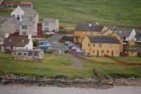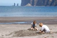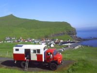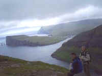 We rijden verder naar Gjogv (spreek uit: jag), het noordelijkste punt van het eiland Eysturoy. Gjogv is een idyllisch dorpje gelegen aan een gorge in de Atlantische Oceaan en aan een 200m hoge klif. Je hebt er uitzicht op die vogelklif, op de andere kaap van het eiland en op het eiland Kolsoy. Het is zeer zonnig weer. We beklimmen de vogelklif als avondwandeling. Een roekeloze meeuw raakt voor onze ogen vast in de prikkeldraad, maar wordt door Roelien voorzichtig bevrijd. De wandeling loont de moeite. Het uitzicht op de klif en even verder op de kaap is prachtig en het is zelfs zo warm dat we ons neervleien in het gras met voor ons de azuurblauwe oceaan, rechts de vogelklif en links de kaap. 11 juli. Prachtig zonnig weer. We rijden van Gjogv naar Tjornuvik. Tjornuvik is het noordelijkste punt van het eiland Streymoy. Onderweg stoppen we aan Fossa, de grootste waterval in de Faroer. In twee trappen stort ze zich 140 m omlaag. Prachtig! Tjornuvik is een prachtig gelegen dorpje van gekleurde huisjes aan een inham in de Atlantische Oceaan. Het ligt aan een zwart zandstrand (enige zandstrand aan de Faroer), omringd door bergen. Vanaf Tjornuvik heb je uitzicht op de in zee uitstekende rotsen Risin (75m) en Kellingin (73m). Volgens de legende probeerde een IJslandse reus en zijn trolvrouw van de Faroer naar IJsland over te steken. Maar omdat ze al te lang ruzie maakten onderweg, werden ze verrast door de zonsopgang en veranderden ze in twee rotsen. Het is prachtig weer. Kinderen spelen op het strand en enkele meisjes gaan pootje baden. Dit is op deze plek heel uitzonderlijk!