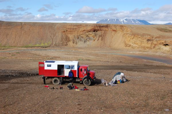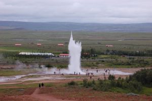| De gouden cirkel. (door Cock) Het is even wennen. Alle vrouwen hebben ons verlaten. Alleen Cock, Filip en Sjoerd zijn nog over. Is samen met de vrouwen ook het geluk vertrokken? De eerste week na hun vertrek brengt ons wat tegenslag. Een uitlaatbeugel die breekt, een radiateurstang die losgetrild is, een lekkende kachel die dagelijks 10 liter water nodig heeft, een koppeling die niet meer werkt en een digitale camera waarvan de (enige!) kaart het begeeft. Huiver mee en lees verder. We starten dit deel met wat toeristische uitjes. Zo gaan we naar Thingvellir, Geysir en Gullfoss. Ook wel bekend als de Gouden Cirkel. Bij Thingvellir maken we een zeer mooie zonsondergang mee. Hoewel ik de nacht ervoor maar 2,5 uur geslapen heb, blijf ik toch fotograferen totdat de laatste zonnestraal om een uur of 11 verdwenen is. De dag ernaar wandelen we door de kloof die de scheiding vormt tussen de Europese en de Amerikaanse continentale plaat. Heel mooi. De volgende stop is bij Geysir. De Geysir werkt echter niet meer, maar zijn broertje Strokkur wel.