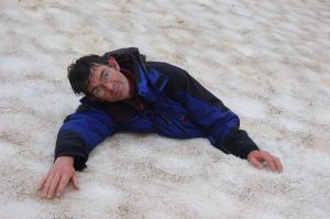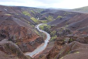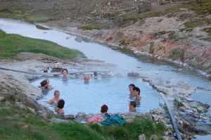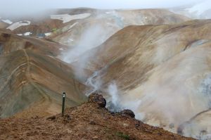 Aan het eind van de dag - als de 'gewone' toeristen verdwenen zijn, komen we bij de Gulfoss aan. Hier genieten we in alle rust van deze zeer fraaie waterval. Een klein stukje verder op gaan we kamperen. We zien dan nog steeds de nevel van de Gullfoss. Een heel aparte verrassing is het warme bronnengebied van Kerlingarfjoll. Hoewel we deze dag al verwend zijn geweest met een wandeling bij een gletsjermeer, worden we nu nog verder aangenaam getroffen. De bronnen liggen op ruim 1000 meter hoog en het is hier echt puur natuur. Net zoals het weer. Stormachtige wind en laaghangende bewolking geven het ene moment een prachtig uitzicht en even later zie je geen hand voor ogen. Warm is het ook niet. Filip en ik maken nog een extra rondje. Waarbij we verdwalen en de GPS ook geen uitkomst meer bied. Na zeer vele loopuren, een doorwading, Cock die door een sneeuwveld zakt en momenten van vertwijfeling komen we om half 11 - het begint al weer donker te worden - bj Sjoerd aan. Gelukkig is hij bij de auto gebleven en heeft hij geen zoekacties gestart. De dag is nog niet voorbij. Vanwege het weer is het niet te doen om hier de nacht door te brengen. Over de glibberige wegen gaan we weer naar beneden. De BraVo heeft continue de neiging om de greppel in te glijden. Uiteindelijk doet ie dat ook. We zijn vrij lang bezig om hem weer op het rechte pad te krijgen. Ik vrees dat we de weg behoorlijk gesloopt hebben ter plekke. De dag erna is het weer prachtig weer. Zie de foto op de openingspagina. In Hveravellir gaan we goed gebruik maken van de geothermische warmte en zitten langdurig in het warme bad. Overigens is dat voor mij nadat ik 35 km hardgelopen heb. In 4,5 uur tijd. Ik krijg ondertussen vertrouwen in de marathon van Reykjavik op zaterdag 19 augustus. Dat is nog ruim 1 week. Ook een mooie training was de stairrun in een elektriciteitscentrale. 240 meter omhoog over 1188 treden. Het record staat op ruim 9 minuten. Ik had er ruim 11 minuten voor nodig en eindigde hiermee op de 29e plaats sinds de start in 1996. Het is een bijzondere manier van traplopen. Door de steilte moet je je eigenlijk oom met je armen omhoog trekken. Het duurde even voordat ik dat doorhad. Een volgende keer moet sneller kunnen.