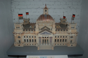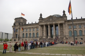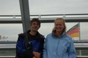 De Rijksdag in Berlijn Op weg naar Polen kom je zo'n beetje door Berlijn. Dus willen we dat wel weer bezoeken. Kijken of we nog wat herkennen van 1994. Eerst een persoonlijk relaas en de voordelen van een gebrek. Ik (Roelien) ben met ischias aan deze vakantie begonnen. Het ging eigenlijk steeds beter, maar vandaag is het weer helemaal mis. Het rare is dat ik wel pijnvrij kan fietsen. Dus zetten we de Bravo ergens in een buitenwijk en gaan op de fiets de stad in. We willen de koepel van de Rijksdag op, maar daar staat nu een erg lange rij. Wel anderhalf uur wachten. Dan eerst maar wat andere dingen bekijken: de Brandenburger Tor, de Dom en het bijna ontmantelde Paleis van de Republiek uit de Oost-Duitse tijd. Op deze plek komt nu weer het stadsslot terug wat de Oostduitsers voor de bouw van het Paleis hebben afgebroken. We bezoeken nog een tentoonstelling over het recente verleden van de Duitslanden (waarbij de VW Kever en de Trabant een rol spelen) en gaan dan terug naar de Rijksdag. We komen aanfietsen en staan even in de rij die nu nog langer is dan vanmorgen. We overleggen wat te doen. Ik kan geen ruim uur staan. Er komt een dame aan die zegt dat we de fietsen weg moeten zetten. Cock vraagt hoelang de wachttijd is: 1 tot 1,5 uur. Dan ziet de dame mij moeizaam van mijn fiets stappen. Ze vraagt of ik iets aan mijn benen heb. Ik leg uit dat het mijn rug is en dat ik niet lang kan staan. Daarop moeten we met haar meekomen. We mogen via de invalideningang en staan zo na een scherpe controle van onszelf en onze tassen in een mum van tijd boven in de koepel. Een onverwachte wending. De glazen koepel staat symbool voor de transparantie van de democratie en vervangt de oorspronkelijke koepel die in WO-2 verloren is gegaan (zie plaatje hieronder). We genieten van het uitzicht over de stad, werpen een blik naar beneden in de Duitse Tweedekamer en bekijken een fototentoonstelling over de geschiedenis van de Rijksdag.