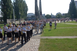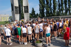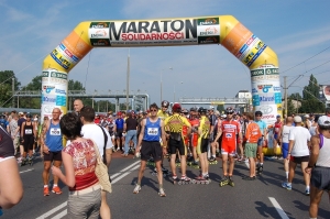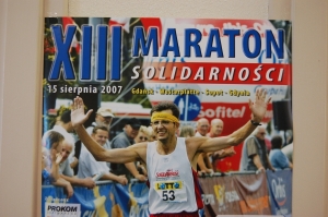 De Marathon van Solidarnosc Wanneer de hekken van de voormalige Lenin Scheepswerf opengaan, wandelen alle marathonlopers naar het monument dat de herinnering levend moet houden aan de gedode werfarbeiders. Dit is dan ook niet zomaar een marathon, maar de Marathon van Solidarnosc. De vakbond van Lech Walesa die Polen uit de communistische duisternis heeft geleid. Er worden een paar korte toespraken gehouden, er worden bloemen gelegd en dan gaan we achter de vlag van Solidarnosc naar de start. Om 10.15 uur precies klinkt het startschot.