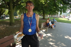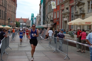 Zo'n beetje de hele loop gaat langs werven. Alleen rond het 21,1 km-punt (halfweg dus) gaan we door de oude monumentale binnenstad van Gdansk. Thermometers langs de weg laten temperaturen zien van 28 tot 34 graad Celcius. Best wel warm voor een marathon. De eerste 30 km loop ik lekker. De laatste 12 km zal ik je niet mee lastig vallen. Na ruim (heel ruim...) 4 uur kom ik bij de finish aan en ontvang m'n medaille. In andere plaatsen krijg je verantwoord eten en drinken na afloop. Hier geen isotone drankjes, maar bier en broodjes worst. Eigenlijk veel lekkerder.